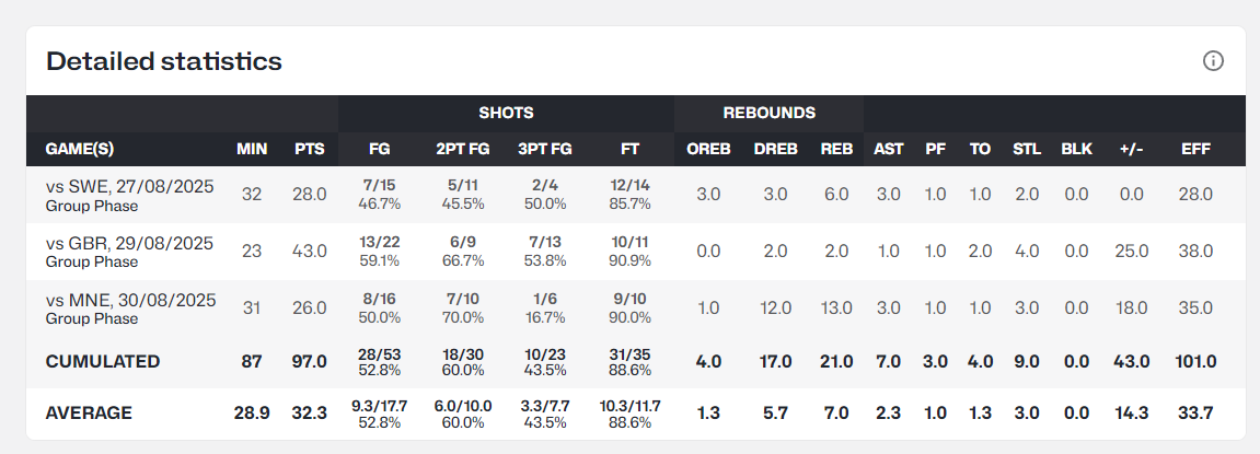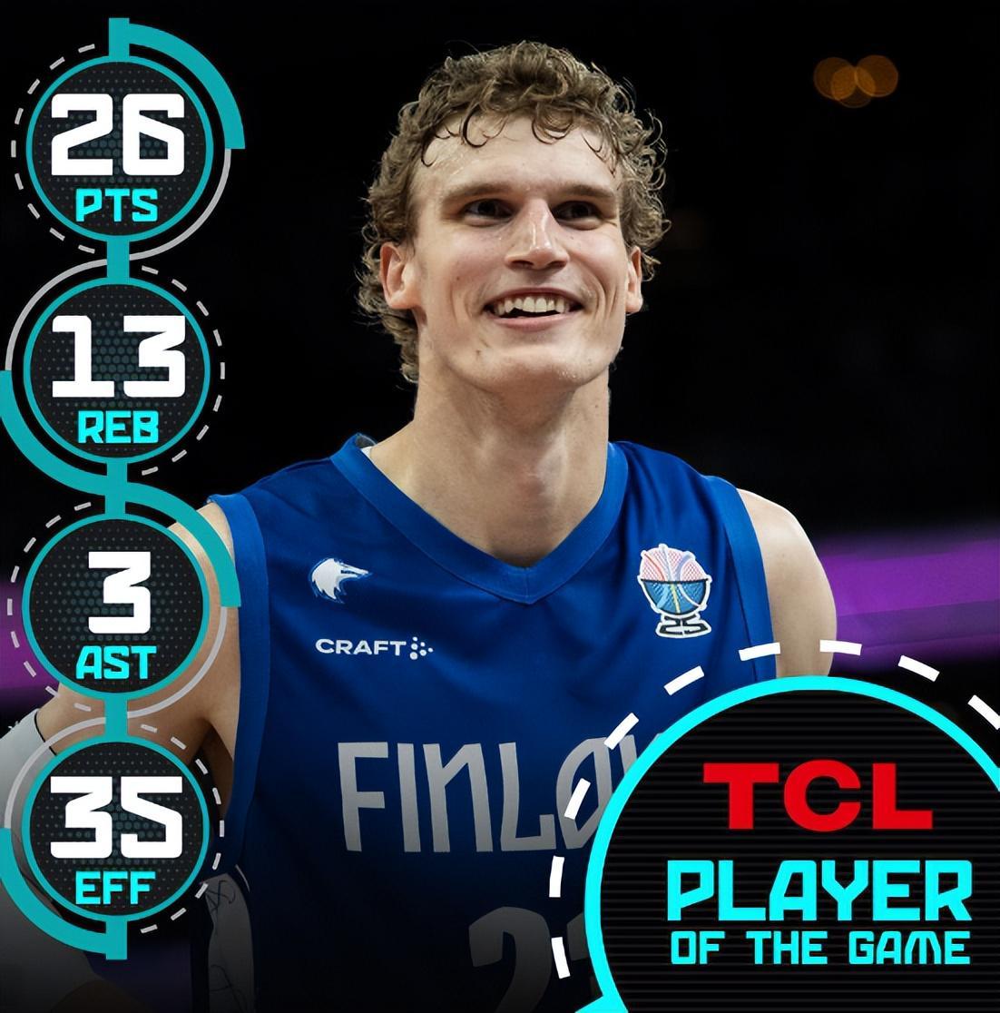 这场比赛劳里-马尔卡宁依旧是芬兰最出色的那个,尤其是第三节他单节拿到9分彻底浇灭了黑山的反扑气焰,全场比赛31分钟,16中8,三分6中1,罚球10中9,拿到26分13篮板3助攻3抢断1失误,命中率50%,正负值+18,效率值+35。